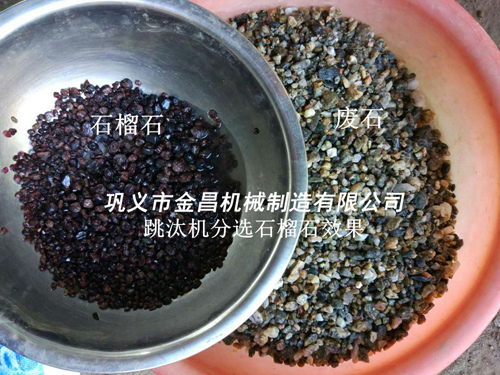 因為石榴石的比重較大,而脈石的比重較小,兩者有很明顯的比重差,跳汰機正是根據(jù)物體比重差進(jìn)行分選的設(shè)備,效果是很不錯的。下邊圖片是鞏義市金昌機械用跳汰機分選出的石榴石效果,您可以參考一下。